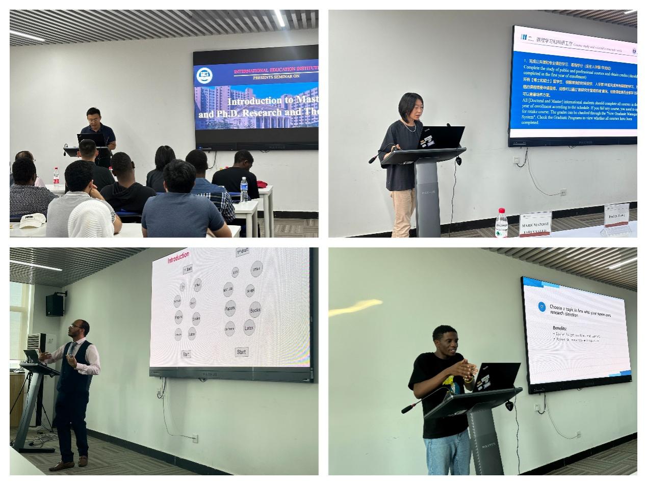 武婉姝结合硕博职工人才培养方案,详细介绍了职工硕士及博士毕业的具体要求和流程。2024届硕士毕业生CHISHA IGNITIUS MWILA和博士毕业生MARK MAZOOZ FARES SAIED分别分享了他们在硕士和博士阶段的科研心得与论文写作经验,鼓励职工积极投入科研工作,在日常学习过程中积极保持与导师和同学的沟通。