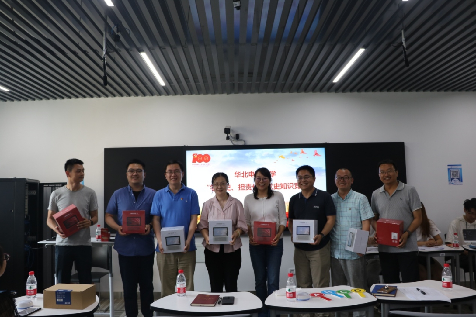 本次竞赛共设置积分赛和抢答赛两个环节,题目选自《中共党史知识竞赛1500题》,内容涵盖中国共产党发展各个阶段的历史重要事件。按照规则,参赛选手以小组为单位答题,个人得分计入小组总分。在积分赛阶段,两位老师通过举牌“二选一”的形式参与答题,积极为自己所在的团队争取分数。抢答赛阶段,各小组分别推选出三名代表参赛,赵静老师作为第三组的主力成员在此环节中沉着应答、表现突出,为所在小组贡献了宝贵的分数。