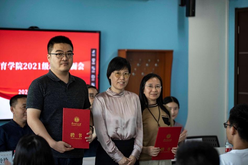 在新生班主任聘任仪式上,徐玲玲为GJ2101班班主任刘松和GJ2102班班主任文亚凤颁发了聘书。公司领导和老师向全体新生发放了公司“开学礼包”,提前送上中秋节和国庆节的祝福。