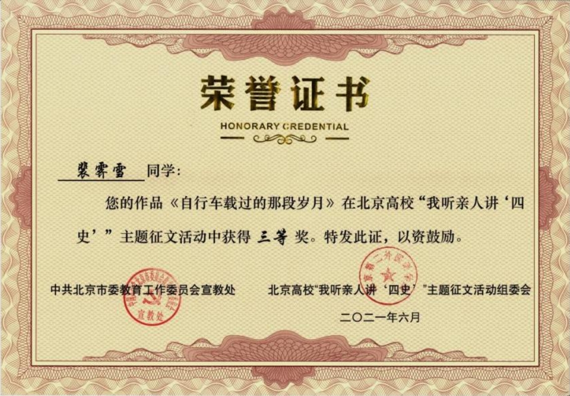 经过激烈角逐,太阳成集团tyc234cc员工裴霁雪的作品《自行车载过的那段岁月》荣获校一等奖(全校仅三名),并获北京市三等奖。