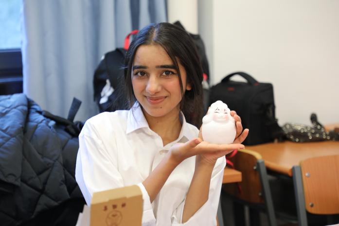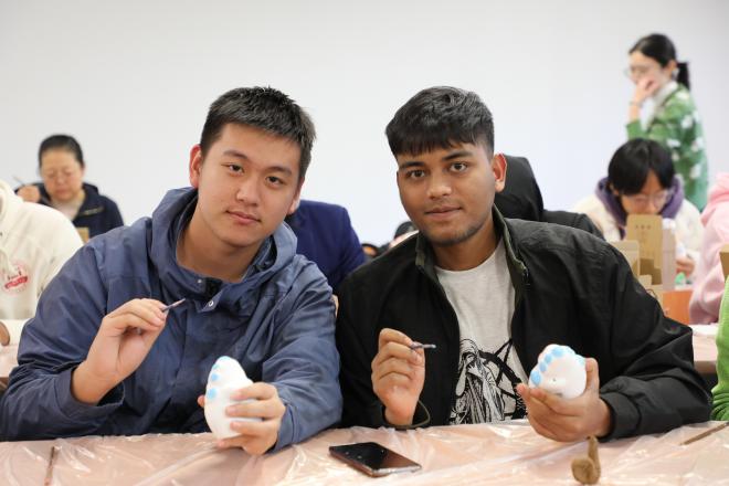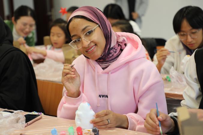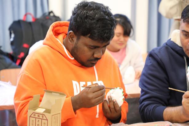 接下来,大家拿出了提前准备好的兔儿爷泥塑,在张老师的指导下准备彩绘属于自己的兔儿爷。随着画笔的游走,兔儿爷的眼睛变得炯炯有神,仿佛在诉说着古老的故事。大家用自己喜爱的颜料勾勒出装饰的花纹,让兔儿爷更加华丽夺目。一名来自巴基斯坦的职工萨伊德在张老师的指导下为兔儿爷画上了水波纹和游动的鱼,他表示,自己的家乡有中巴经济走廊首个水电投资项目卡洛特水电站,绿色能源正在创建清洁美丽世界。“我的兔儿爷象征着绿色发展”,萨伊德笑着说。大家沉浸在创作的喜悦中,赋予了泥塑兔儿爷新的生命与活力。