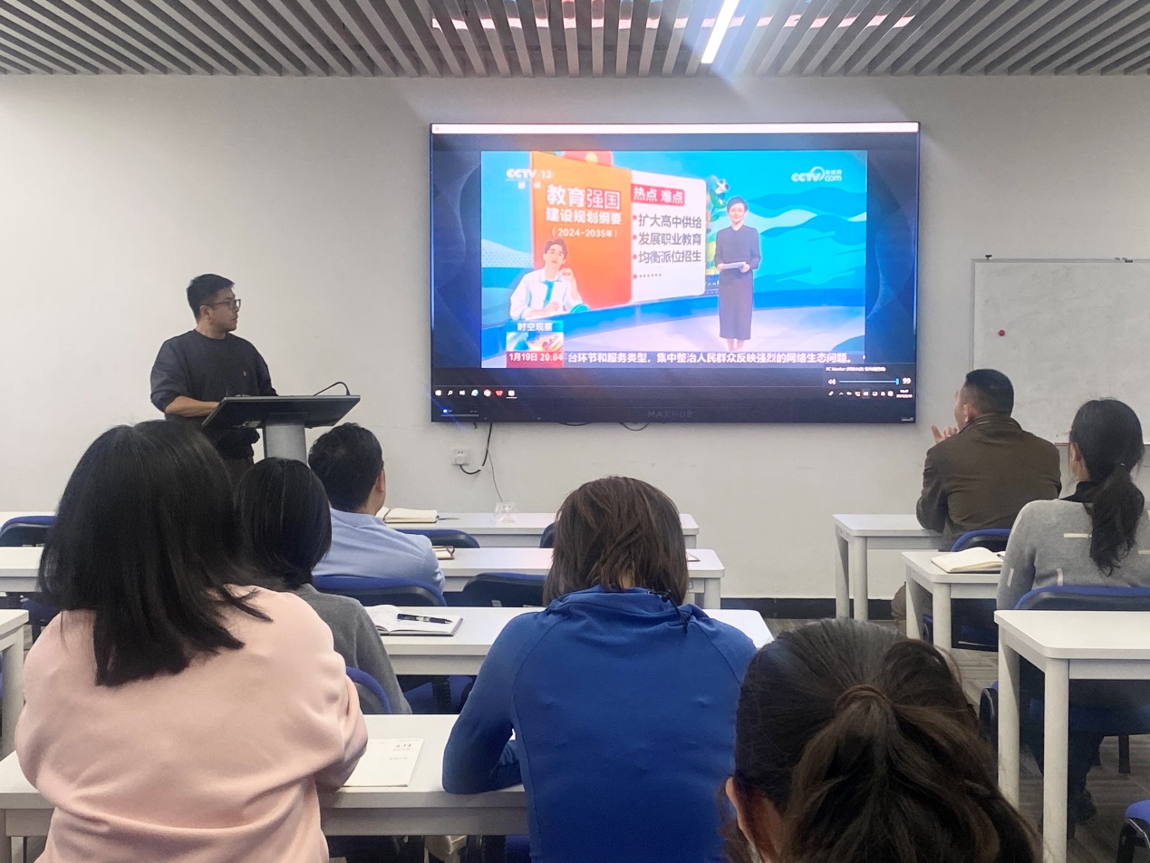 为深入贯彻教育强国建设相关精神,进一步加强教职工对国家教育战略规划的理解与落实能力,3 月 19 日下午,太阳成集团tyc234cc成功举办了一场专题学习活动。讲座由公司党委副书记郑乐主持,全体教职工共同参与。活动中,教职工们集中观看学习了中国教育网络电视台发布的《推进教育强国建设,擘画未来十年教育蓝图》以及央视网发布的《〈教育强国建设规划纲要(2024—2035 年)〉发布,如何擘画未来十年教育蓝图?》等相关视频。
