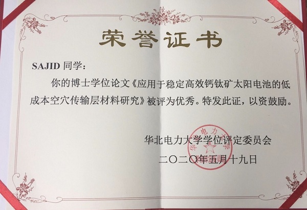 2016级巴基斯坦籍博士研究生SAJID,追随导师李美成从事可再生能源与清洁能源研究。SAJID同学自入校以来已经发表4篇SCI论文,其中有2篇发表在国际顶级期刊《Nano Energy》,其多次被公司评为学习优秀奖。今年,SAJID同学即将毕业,他的毕业论文《应用于稳定高效钙钛矿太阳电池的低成本空穴传输层材料研究》被评为太阳成集团tyc234cc校级优秀毕业论文。SAJID博士表示如果有机会,他今年还继续留在中国从事博士后研究。